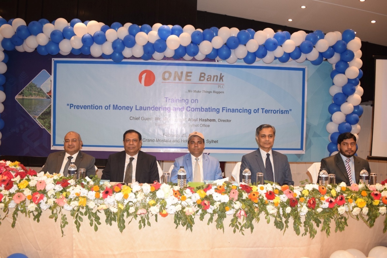 ONE Bank PLC recently arranged a daylong training on 'Prevention of Money Laundering and Combating Financing of Terrorism' at Grand Mostafa and Hotel Ababil, Sylhet for the executives and officers of branches and sub-branches of Sylhet Zone, including Brahmanbaria SME/Agri and Solimgonj branches.