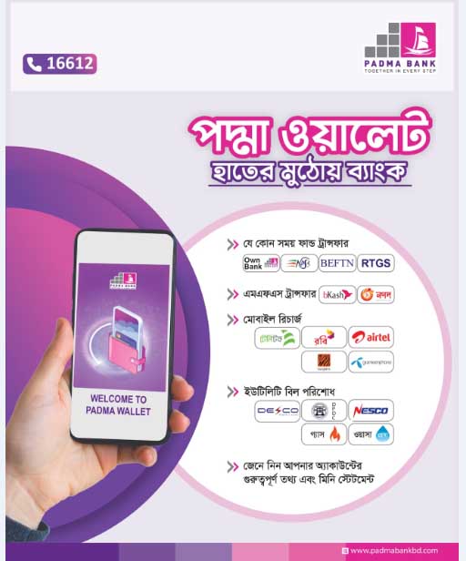 Apart from this, there are mobile recharge, electronic fund transfer, and real-time gross settlement (RTGS) facilities for sending money to other banks. Paying service bills through Padma Wallet is the easiest. Gas (Jalalabad, Bakhrabad, Western Region), Electricity (DESCO, DPDC, West Power Zone, NESCO), Water (Khulna Wasa, Dhaka Wasa, Rajshahi Wasa), BTCL Internet Bill, and Other Government Benefits like Land Tax, Parcha, Mutation, NSDI, etc. can be paid easily.
