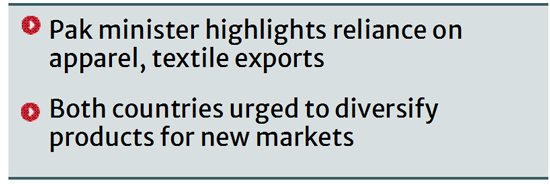Highlighting areas of cooperation, Pakistan's minister Jam Kamal Khan said both countries rely heavily on apparel and textile exports and stressed the need to diversify products to access new markets.