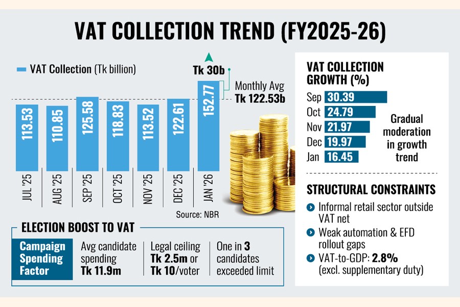 A surge in election-related spending in recent months appears to have provided a short-term boost to value-added tax (VAT) collection, with January 2026 revenue standing Tk 30 billion above the July-December monthly average.