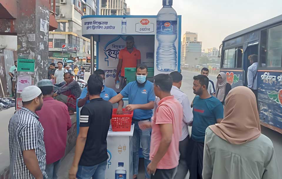 Many fasting people get stuck on the road at the Iftar moment due to traffic jams and other reasons. To give relief to the fasting people at that moment, the popular drinking water brand PRAN Drinking Water is distributing Iftar items at different points in the capital, a press release said.