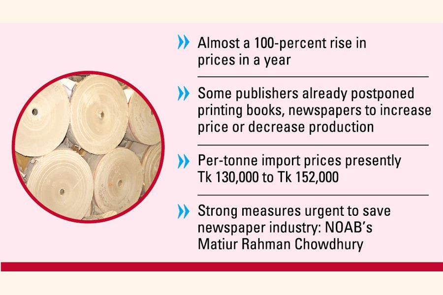 Traders in Dhaka's Nayabazar and Fakirerpool hubs said the price of per-tonne newsprint papers increased almost 100 per cent on average over the year.