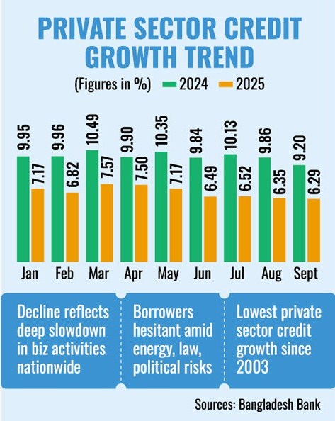 Data from Bangladesh Bank (BB) on private sector credit growth, available since 2003, shows that credit growth has never dropped this low, even during previous financial shocks.