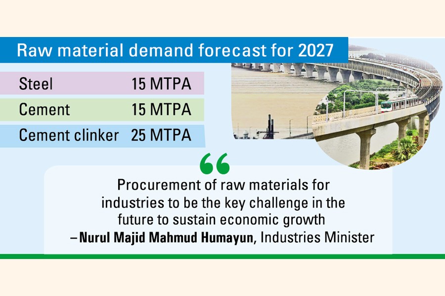 Industries Minister Nurul Majid Mahmud Humayun Tuesday said demand for steel is expected to reach 15 million tonnes per annum (MTPA) by 2027 due to the ongoing boom in infrastructure development.