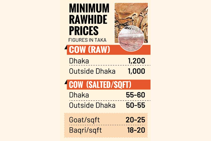 Last year, the prices of rawhide from sacrificial cows were Tk 50-55 per square foot (sqft) in the capital city and Tk 45-48 per sqft outside of Dhaka. Goat hides and baqri skins were priced at Tk 18-20 per sqft and Tk 12-14 per sqft, respectively.