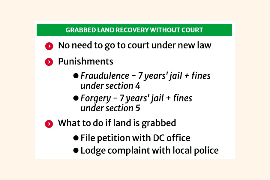 As per the act, to recover grabbed land, the real owner should file a petition with the office of the deputy commissioner (DC) and submit the land deed, khatiyan, and other legal documents.