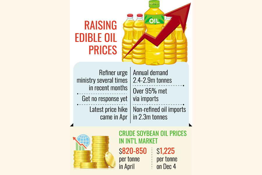 The Bangladesh Vegetable Oil Refiners' and Vanaspati Manufacturers' Association (BVORVMA) urged the commerce ministry in June and November this year, and also in between, to adjust soybean and palm oil prices, but got no response.