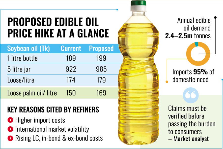 If the refiners' proposal is implemented, the price of a one-litre bottle of soybean oil will jump to Tk199 from the current retail price of Tk 189.