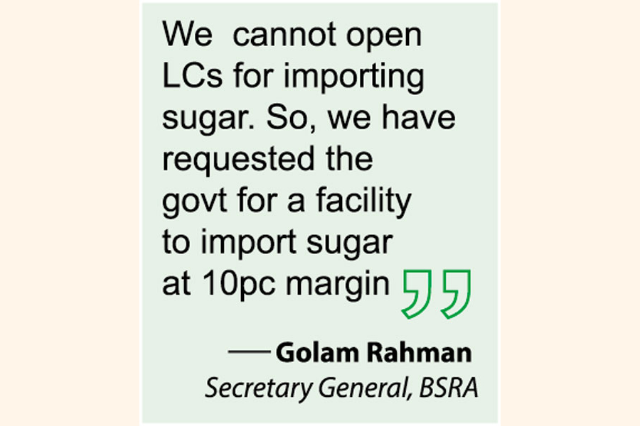 When contacted, Secretary General of BSRA Golam Rahman said, "We cannot open LCs for importing sugar. So, we have requested the government for a facility to import sugar at 10 per cent margin. We have also requested to address other problems in the sector."