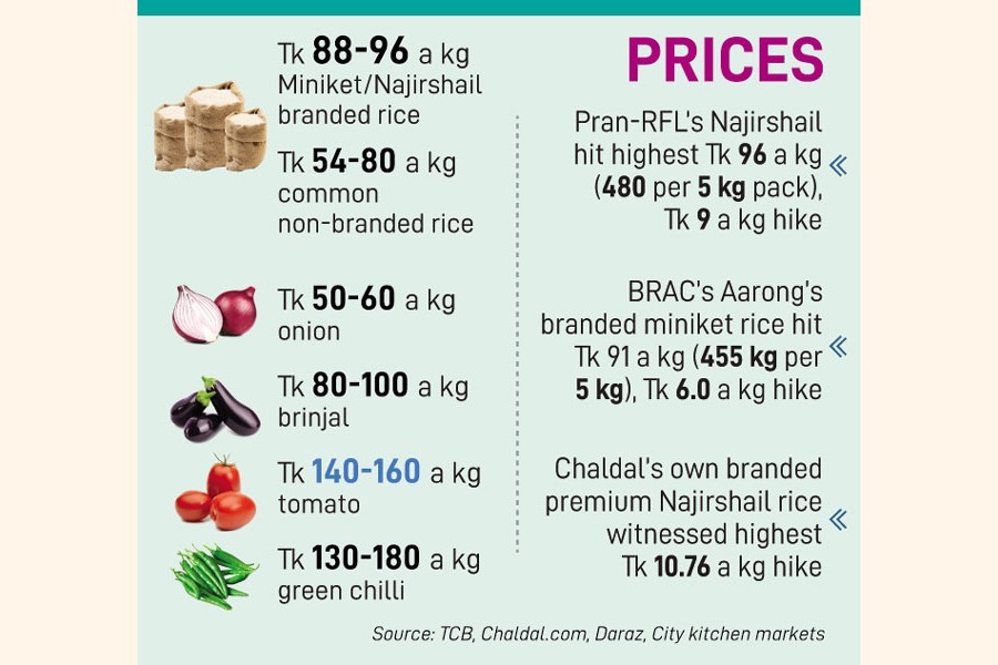 Its premium Najirshail rice price witnessed the highest Tk 10.76 a kg hike in last two weeks, and was selling at Tk 2,019 per 25-kg pack, according to its website.