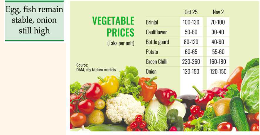 Brinjal, bitter gourd, and teasel gourd have been selling between Tk 80-100 per kg, while green papaya is available at Tk 40 a kg, all significantly affordable compared to the recent highs exceeding Tk 100 a kg.