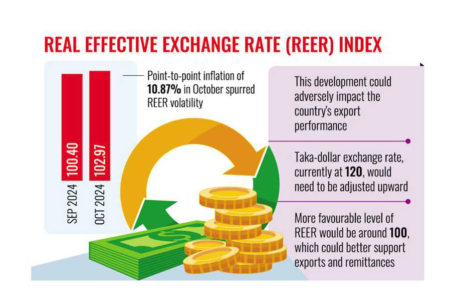 According to the latest measure for October 2024, prepared by Bangladesh Bank, the central bank, this increase reflects the rising price levels in Bangladesh compared to its 15-currency-trade-basket partners.