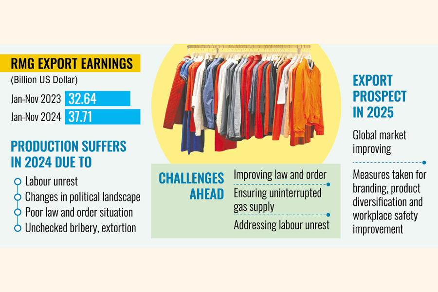 Exporters highlighted that recurring workers' protests especially in the industrial belt of Ashulia over a number of demands have been a cause of concern among buyers. They are still worried, as law and order situation has not fully improved. They said that 2025 could offer a better outlook if these pressing issues, including energy supply and law and order, are addressed.