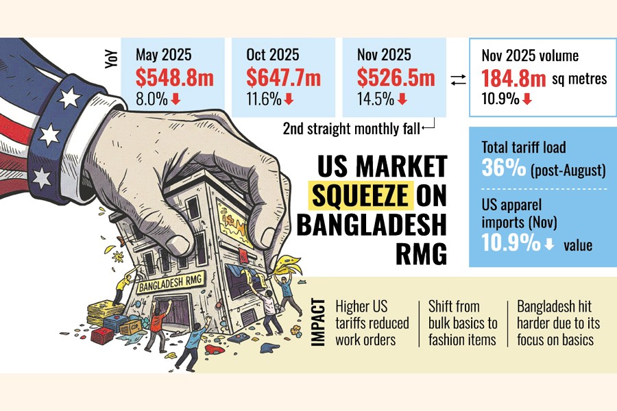 Bangladesh's ready-made garment (RMG) exports to its largest destination, the United States, declined both in value and volume year on year in November 2025 as higher tariffs dampened demand and forced changes in work-order patterns.