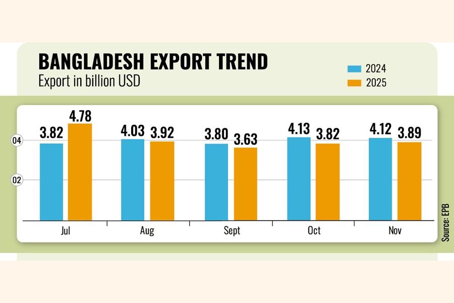 Bangladesh's single-month merchandise export earnings in November 2025 declined for the fourth consecutive month on a year-on-year basis, registering a 5.58 per cent fall compared to the same month in 2024.