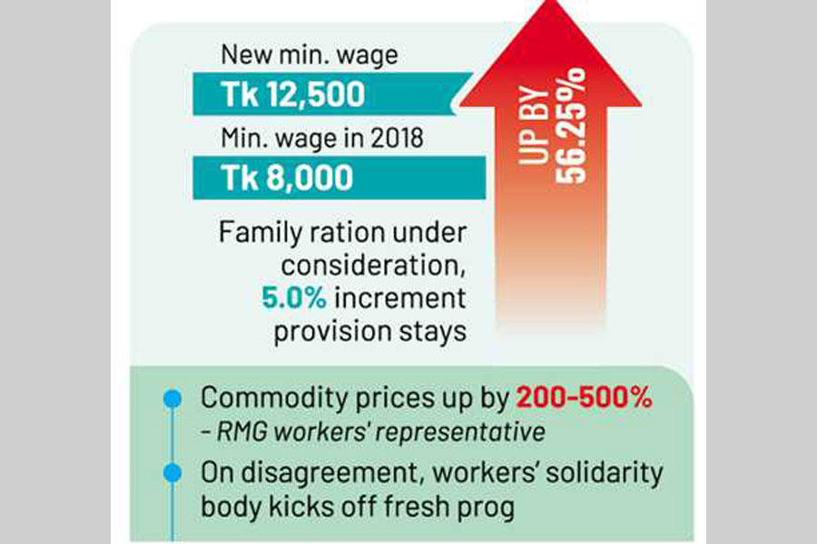Garment workers' minimum wage has been fixed at Tk 12,500 on an increase of 56.25 per cent over the present monthly pay, an official announcement said Tuesday, amid violent labour protests.