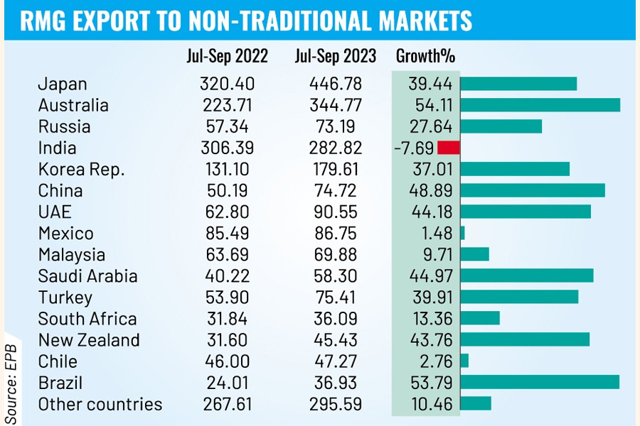Exports to other major non-traditional markets like Japan, Australia, Russia, Korea, China and the UAE increased by a range between 27 per cent and 54 per cent during the period, according to data.
