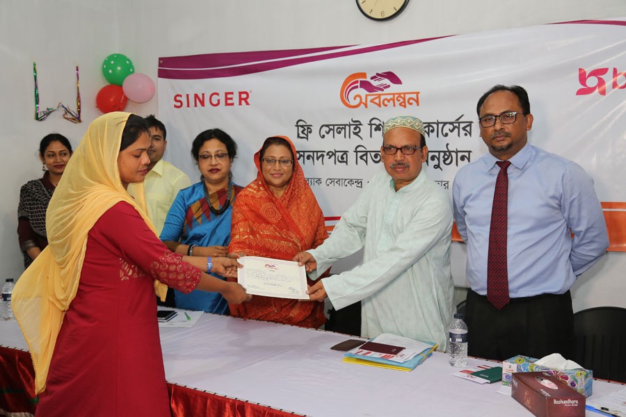 Darfin Akhter, Savar Municipality Councillor, Ahsan Ullah Labu, Senior Vice President of Bangladesh Human Rights Council, Raziur Rahman, Senior Manager - Marketing Communication of SINGER Bangladesh Ltd and Mazharul Islam, Skill Development Manager of Brac distributed the certificates among 44 women in Savar who completed the tailoring course.