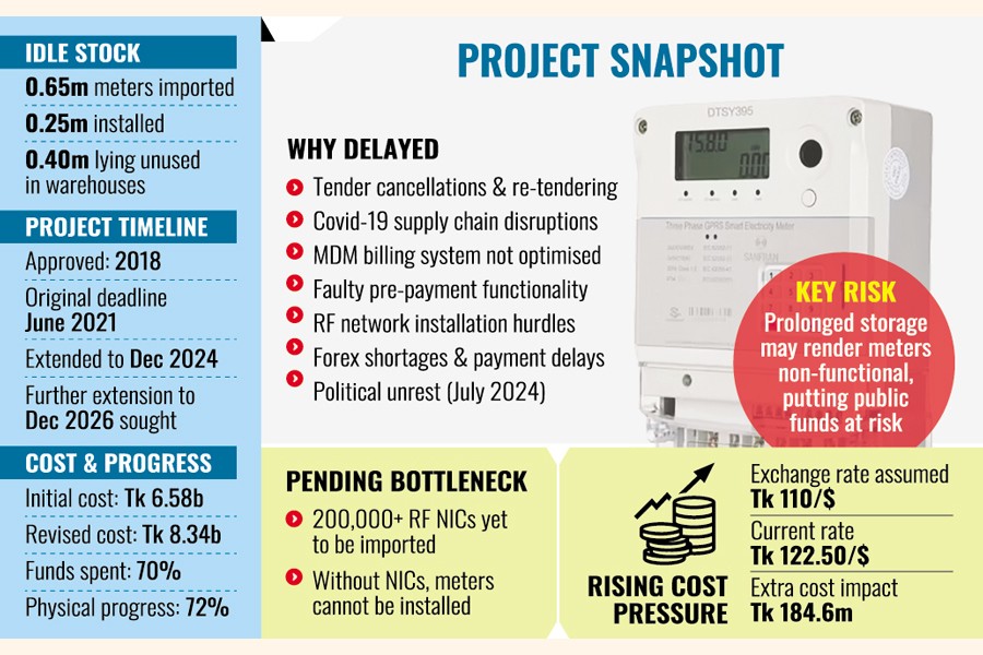 Around 0.4 million smart pre-payment meters imported under Dhaka Power Distribution Company's (DPDC) long-delayed smart-metering project are lying idle in warehouses, raising concerns about possible technical deterioration and inefficient use of public funds.