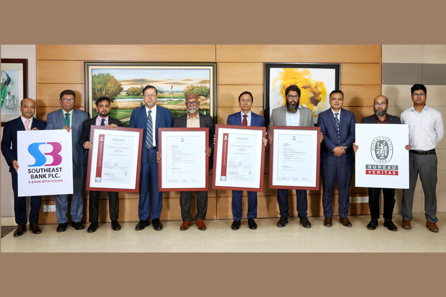 Mr Nuruddin Md Sadeque Hossain, Managing Director of Southeast Bank PLC, received the certification from Mr Mahmudul Islam Khan, Senior Executive Business Development, Certification, Bureau Veritas (Bangladesh) Pvt Ltd. Deputy Managing Directors Mr Md Masum Uddin Khan and Mr Abidur Rahman Chowdhury, along with other senior officials of Southeast Bank and Iota Consulting BD, a local consulting partner for ISO certification, were also present on the occasion.