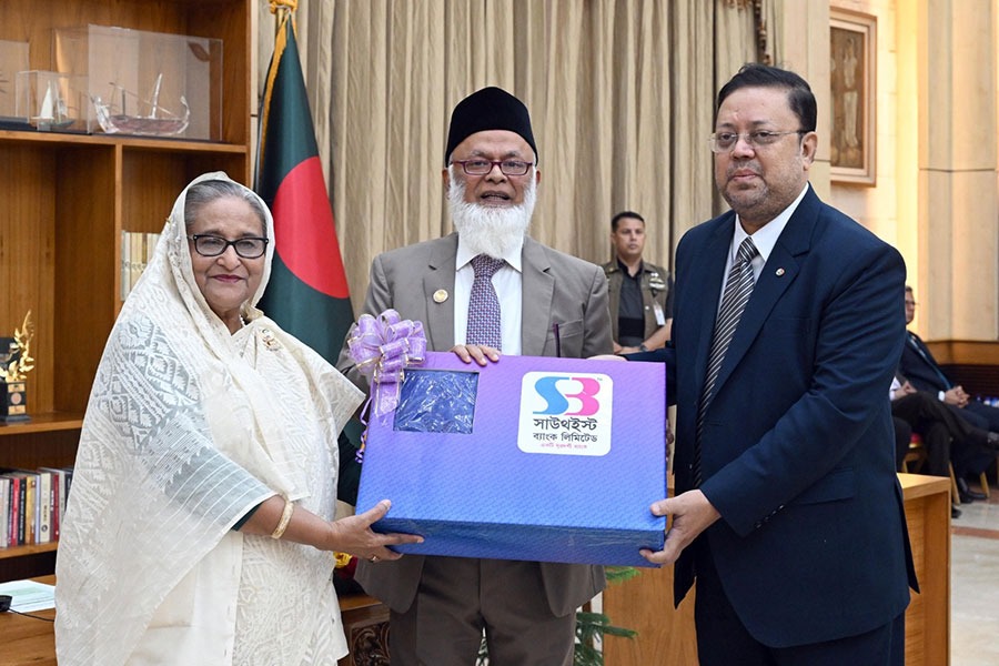 Prime Minister Sheikh Hasina received the blankets from Nuruddin Md Sadeque Hossain, Managing Director of Southeast Bank Limited, at a programme on Thursday.