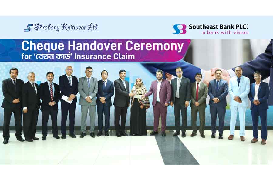 Southeast Bank PLC has handed over an insurance claim cheque to the family of a deceased employee of Shrabony Knitwear Ltd. under the Group Insurance Coverage of the bank’s “BETON CARD” program.