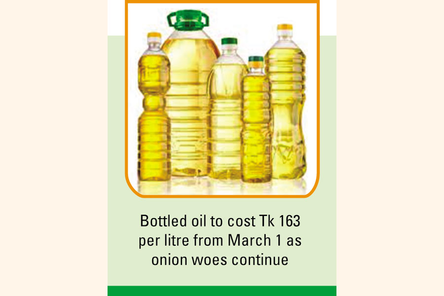 The government announced a Tk 10-per-litre cut on both branded bottled and non-branded soybean oils, effective from March 1. This will bring the price of branded oil down to Tk 163 per litre from Tk 173.