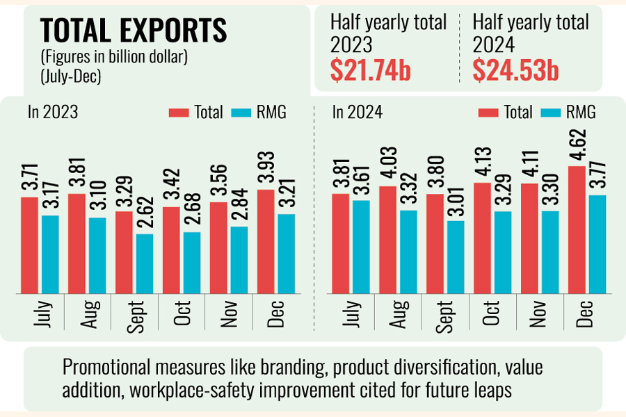 A steady 17.72-percent growth to US$4.62 billion in December raised Bangladesh's merchandise-export earnings to $24.53 billion in the first six months (H1) of this fiscal, and exporters hope for a yet better tomorrow.