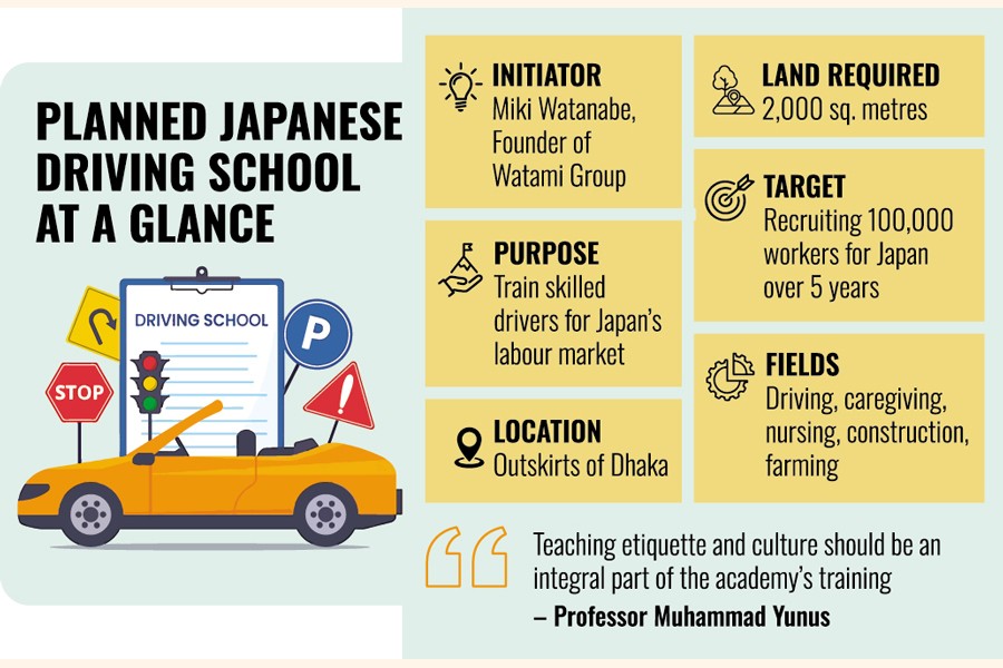 A long-time admirer of Professor Yunus's work, Mr Watanabe said he had already set up a language training academy in Monohordi, Munshiganj, to train and recruit at least 3,000 Bangladeshi workers.