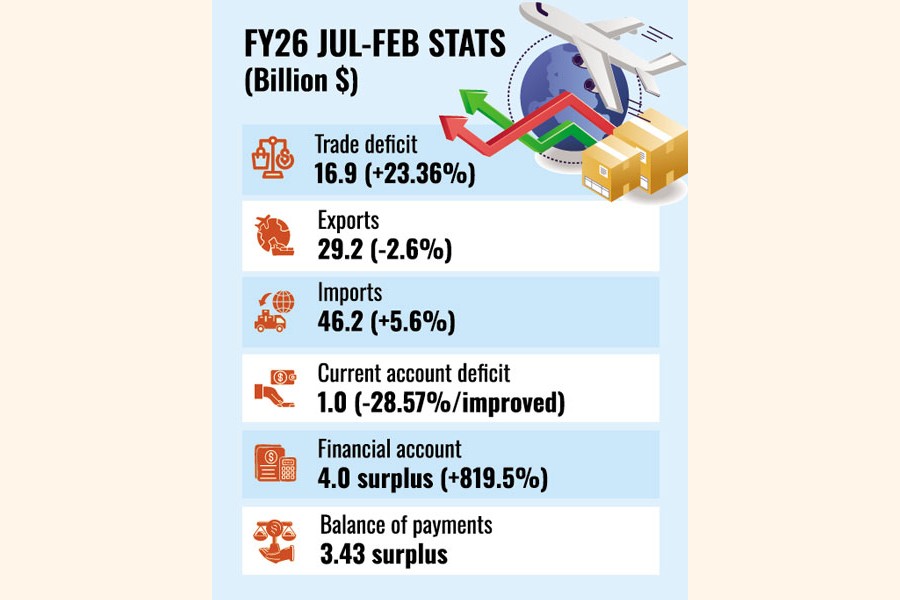 The trade deficit stood at $16.9 billion during the period under review, up from $13.7 billion in the same period a year earlier, according to balance-of- payments (BoP) data prepared by the Bangladesh Bank.