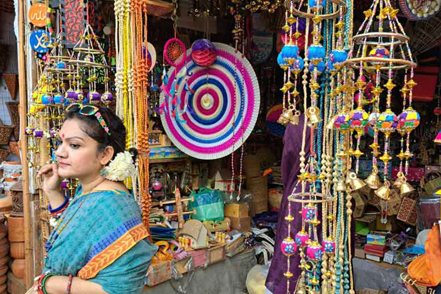 Jewellery boxes, model rickshaws, jute embroidered bags and hangings, paper flowers, paper birds, spinning wheels, ghungroos, balloons – there seemed to be no end to them.
