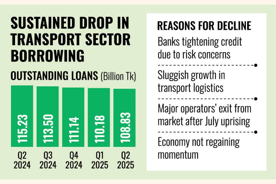 According to the latest central bank data, the outstanding transport loans stood at Tk 108.83 billion in April-June 2025, down from Tk 115.23 billion in April-June 2024, marking a year-on-year decline of 5.55 per cent.
