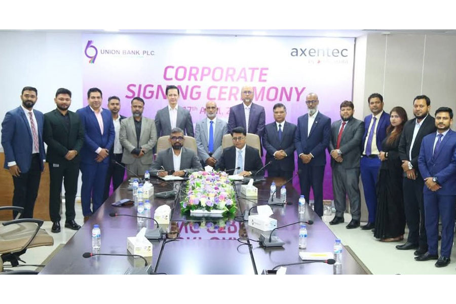 In the presence of the of Managing Director & CEO of Union Bank PLC Mr. Mohd. Humayun Kabir and Chief Executive Officer of Axentec PLC Mr. Md. Adil Hossain Nobel, the head of the Corporate Affairs and Branding Division of Union Bank Mr. Abu Kawser and Chief Commercial Officer of Axentec PLC Mr. Abul Kalam Mohammad Nazmul Islam signed the agreement on behalf of their respective organisations, according to a press release.