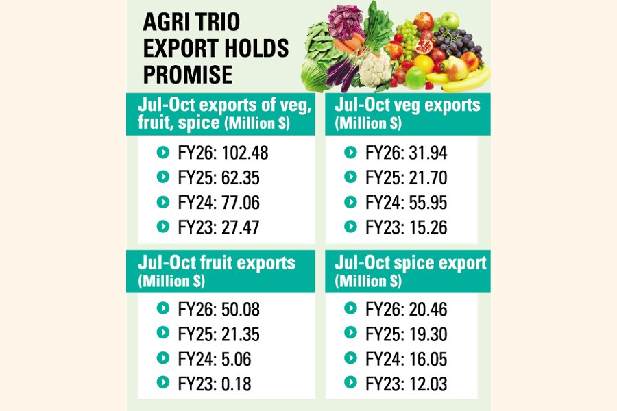Bangladesh's vegetables, fruits, and spices are showing a strong performance in foreign exchange earnings, having already crossed the $100 million export mark in the first four months of this fiscal year, say analysts.