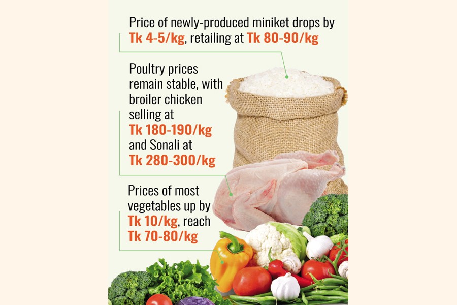 The rice market, however, presented a mixed trend. Price of newly-produced miniket saw Tk4.0-5.0 drop a kg, now retailing at Tk80-90 per kg.