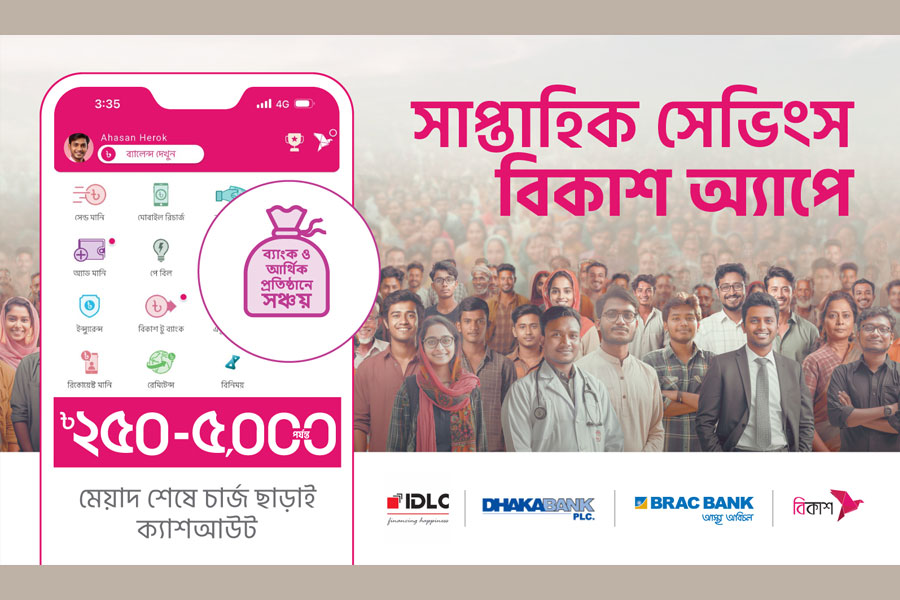 This weekly digital savings service has been launched on bKash app for the first time in the country. From now on, customers, without opening a bank account, can start saving from Tk 250 to Tk 5,000 per week with IDLC Finance, Dhaka Bank and BRAC Bank, according to a media release.