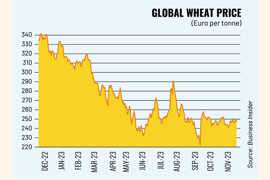 Value chain specialist Prof Rashidul Hasan from Bangladesh Agricultural University said global wheat prices have been showing a downtrend for the last one year. He said the market fell by 30 per cent in a year.
