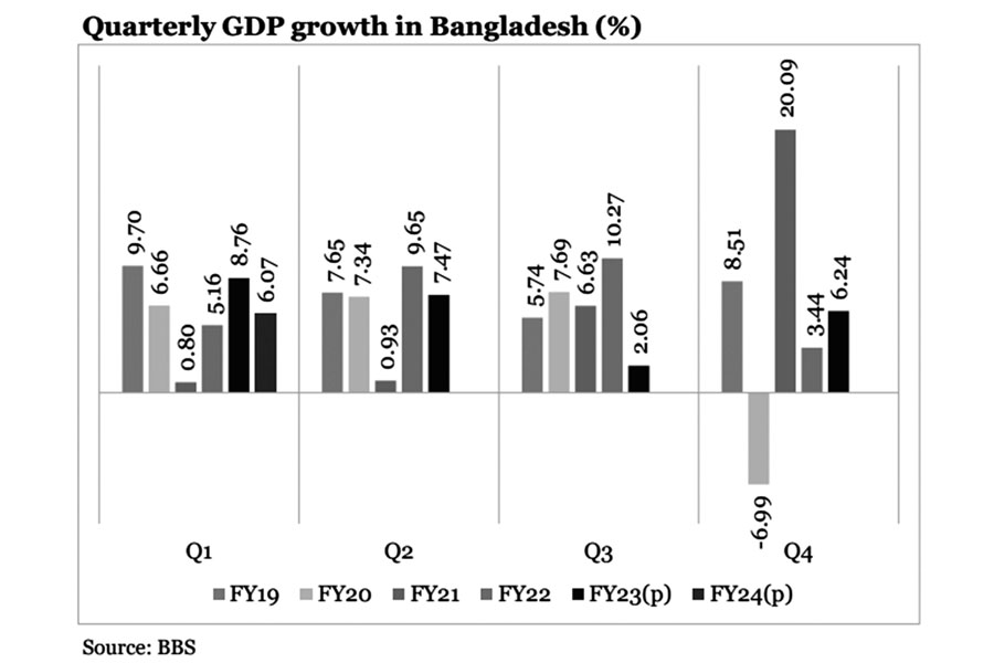 GDP growth declined in the first quarter of FY24. It is encouraging to see that the Bangladesh Bureau of Statistics (BBS) has started to publish quarterly GDP data on a regular basis. During the Jul-Sep period of FY24, estimated GDP growth was 6.07 per cent against the annual target of 7.50 per cent.