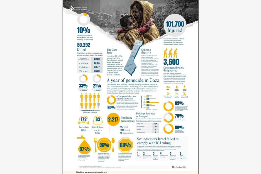 A year has passed since the war of genocide in Gaza was unleashed by Israel. It has taken a toll of 42,350 lives to date, more than 50 per cent of which are those of women and children. According to UNICEF, the number of children dead in Gaza exceed that in any armed conflict in recorded history. Out of 32 hospitals in Gaza not a single exists with their former facilities for treatment of critically ill patients and the growing number of injured. Hundreds of doctors, nurses and medical assistants have either been killed in indiscriminate bombardments or taken as detainees by Israeli army. 70 per cent of buildings and infrastructures have been totally destroyed by bombs and artillery shells leaving the rest in conditions not fit for habitation. Industries, farmlands and shops selling sundry items, including bread and medicines, have been razed to the ground, stopping production of food and other items of daily necessities. Water supply through pipes, electricity generated in power plants and sewerage systems disposing of effluents have been bombed out of existence. Roads and parks in every towns and highways connecting them have deliberately been bulldozed rendering unfit for vehicular traffic.