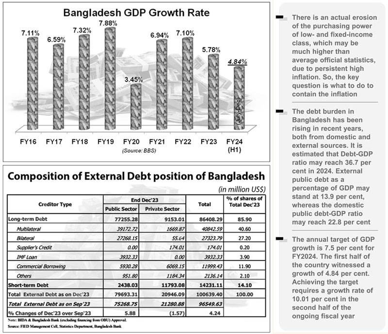 SLOWDOWN OF ECONOMIC GROWTH: The annual target of GDP growth is 7.5 per cent for FY2024. The first half of the country witnessed a growth of 4.84 per cent. Achieving the target requires a growth rate of 10.01 per cent in the second half of the ongoing fiscal year. It may be recalled that the IMF cut the projection for economic growth rate to 5.7 per cent for the current fiscal year.