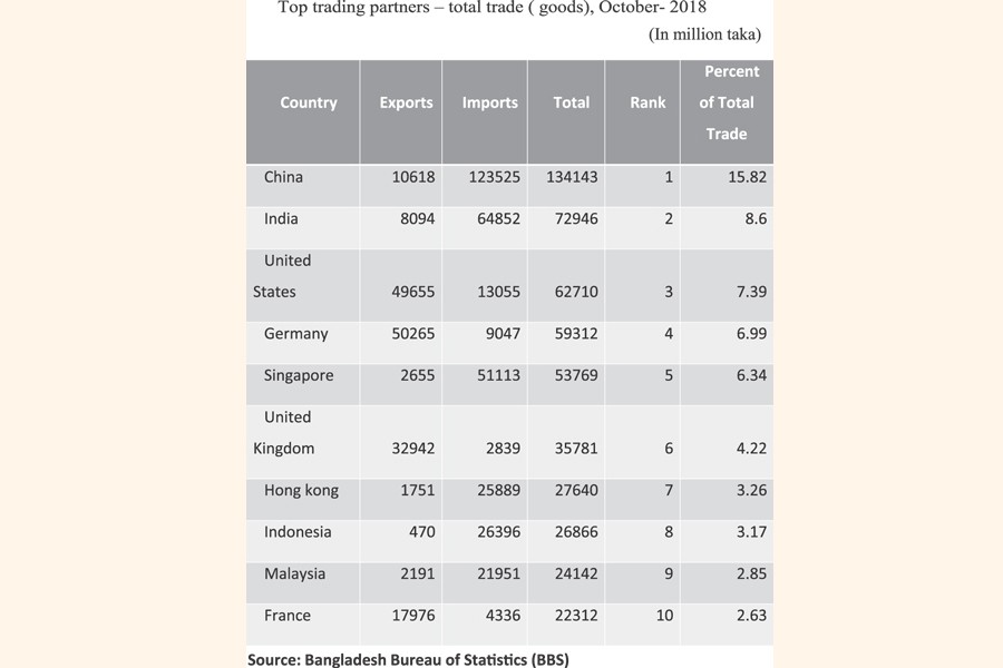 Development of regional connectivity at this moment should be in focus. If rail connectivity with India and China is established, the trade gap may decline. It is high time to start a feasibility study, since the government is very much optimistic about opening new avenues of international trade. Our relationship with India and China is long lasting. So, there is every possibility of minimising the trade gap. Up to October, 2018, India and China exported to Bangladesh goods worth Tk 64,852 million and Tk 123,525 million against Bangladesh's exports worth Tk 8,094 million and Tk 10,618 million. But, exports to the USA rose. Exports to the USA hit Tk 49,655 million against imports worth Tk 13,055 million.