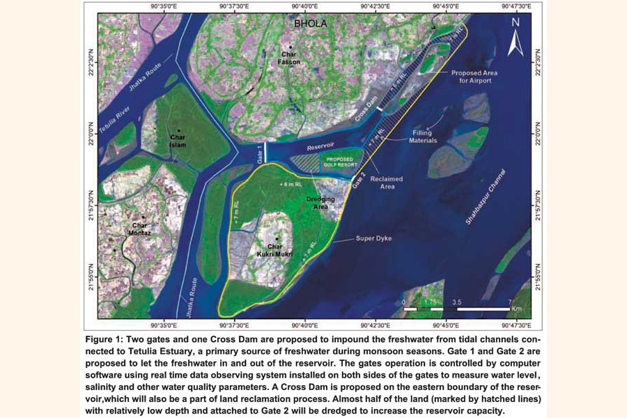 It is estimated that a total of 1,200 billion m3 of freshwater flows into Bangladesh territory every year through international rivers (BDP 2100); the quantity of water being discharged in the Bay of Bengal, however, is not well documented. Considering a big percentage of this volume flows through the estuarine systems of Bangladesh, an insignificant amount of freshwater is probably being used in the coastal area before it's being discharged into the Bay of Bengal. Freshwater reservoir can be an effective means to trap and store this unused freshwater. On the other hand, year-round availability of freshwater for different uses is currently a significant challenge, particularly in the coastal zone. Considering freshwater flow from Tetulia, southern tip of Bhola Island, where the Char Kukri Mukri is located, is a location where development of freshwater reservoir is technically and economically more attractive.