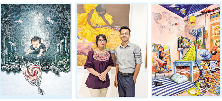 Art that asks questions: One of the show's most notable features is its wide range of materials and styles. Visitors will view woodcut prints, ceramics, oil paintings, and even installations, which is a first for Edge Gallery. The woodcut by Faizur Rahman Firoz depicts a baby creeping toward a dazzling lollipop in a factory wasteland. It's a powerful portrayal of how greed and pollution endanger innocence.