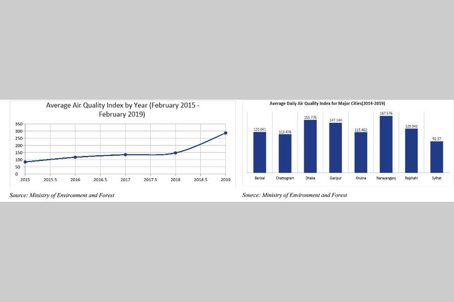 Most of Dhaka city's citizens are regularly troubled by the deteriorating air quality around the city through illnesses and pollution. A "megacity" by definition, Dhaka fails to provide its inhabitants with proper air quality. Other major cities in Bangladesh are not lagging far behind Dhaka in terms of air pollution. As data on Air Quality Index (AQI) from the Ministry of Environment and Forests show, average air quality has been deteriorating gradually in all the cities over the past six years.