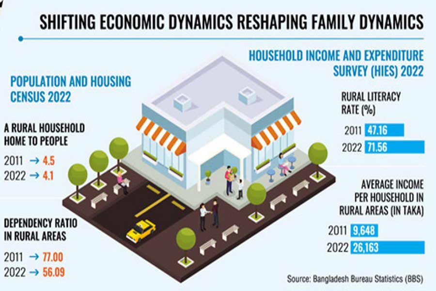 Conversely, advancements in agricultural technologies and mechanization (e.g. tractors, irrigation machinery, combine harvesters) have gradually transformed rural life and the economy. Modernisation in agriculture has reduced the need for farm labour, increased productivity, and enhanced efficiency, leading to a shift in employment from agriculture to other sectors. The nation's shift towards industrialisation and urbanisation has opened up new economic prospects, creating new job opportunities, and people prioritised independent income sources breaking the reliance on collective family resources. The emergence of new job opportunities facilitates urban migration for employment, leading to a shift in resource allocation, and driving growth and development in rural areas while disrupting traditional ways of living and working in rural areas, leading to changes in social structures and family dynamics. The shift of rural nuclear family structure away from the joint family is observed vividly in the Population and Housing Census 2022 report of Bangladesh Bureau Statistics (BBS). Regarding housing size, a rural household is home to 4.1 people, down from 4.5 individuals in 2011. Moreover, the dependency ratio in the rural area dropped to 56.09 in 2022 compared to 77.00 in 2011.