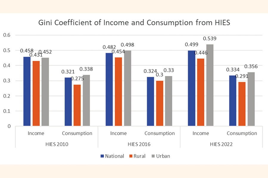 According to the Bangladesh Bureau of Statistics (BBS)'s "Household Income and Expenditure Survey (HIES)-2022" report, the Gini Coefficient for income increased to 0.499 in 2022 from 0.482 in 2016 and 0.458 in 2010. The consumption-related Gini Coefficient increased from 0.324 (2016) and 0.321 (2010) to 0.334 in 2022. In 2016, the average monthly income increased to Tk 15,988 from Tk 11,479 in 2010 whereas in 2022 the average monthly household expenditure rose to Tk 31,500 from Tk 15,715 in 2016 and Tk 11,200 in 2010. In 2022, food consumption expenditures decreased by 45.8%, and non-food consumption increased by 54.2%, compared to 47.7% for food and 52.3% for non-food in 2016.