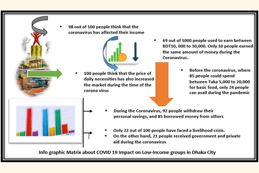 During the five-month general holiday announced by the government due to the Covid-19, its effect on livelihood has been presented here. Daily wage labourers and other informal sector workers are the worst hit. Overall this research has revealed the socio-economic backgrounds of the low-income groups in Dhaka city, especially their sources of income and expenditure alongside assessing their savings and assets status.