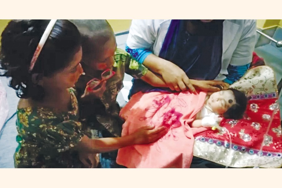 In common parlance, she is called an orphan but her stranger than fiction birth and even more miraculous survival drew sympathy from all corners of the land. She received a hero's reception right from the time her little heart started pulsating and was placed in medical care. The owner of a private hospital in Mymensingh took the responsibility of the baby. Her little hands were bandaged to fix those and given necessary treatment. But when her bilirubin went past the danger mark, she was transferred to the Mymensingh Medical College where a five-member medical board was constituted to look after her.