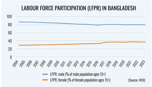 Bangladesh has made remarkable strides towards promoting women's education, health, and employment over the past decades. However, female labour force participation remains disproportionately low, at just 43 per cent, compared to 80 per cent for men. Many women are employed in the garment industry, a cornerstone of Bangladesh's export sector, yet the broader job market remains largely inaccessible due to social and cultural barriers. Family responsibilities, wage disparities, and societal expectations often keep women from realising their economic potential, with 40 per cent of women citing family obligations as a barrier to employment.