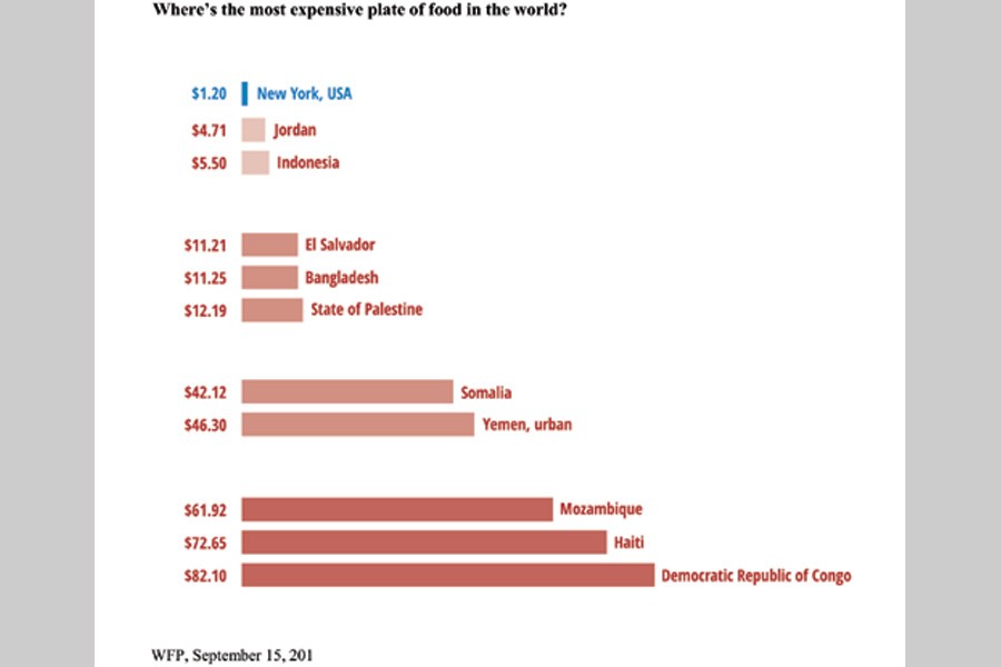 It now costs twice the national daily income to buy a plate of food in South Sudan. Northeast Nigeria took second to last place, at USD $222.05, or 128.6 percent of daily income in 2018, up from USD $200.32, or 121 percent of daily income in 2016.
